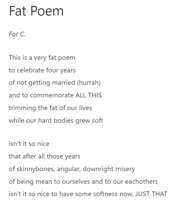We all got so caught up in the brilliance of Brooke Kolcow’s “Fat Poem” that we missed a typo at the end. There was an “is” where there should’ve been an “it” in the last line. We fixed it. Here’s the poem: